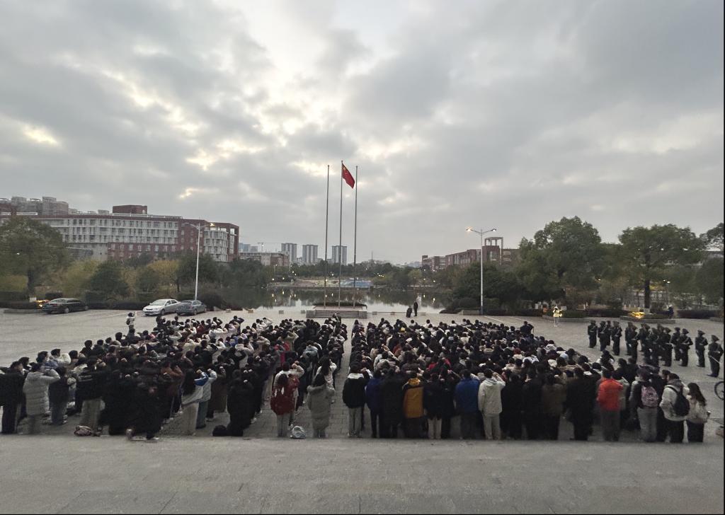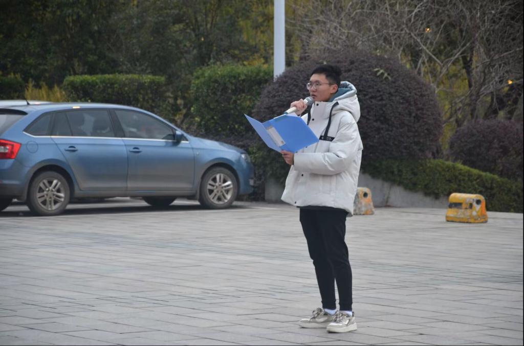 在振奋人心的国歌声里,五星红旗冉冉升起。同学们在国旗下庄严宣誓:“志存高远,坚定信念,热爱祖国,服务人民……”随后,水利2303班王凯旋同学进行了题为《历史不容遗忘,吾辈更当自强》的国旗下演讲,他讲述了86年前南京大屠杀的惨痛历史,号召同学们铭记历史,缅怀先烈,努力学习专业知识,积极参加活动比赛,为投身祖国水利事业建设打下坚实基础。张海林老师对同学们良好的精神风貌给予肯定,并希望同学们树立远大理想,明确学习目标,牢记“共治江河湖海,同建绿水青山”的使命,不惧严寒,吃苦耐劳,奋勇前行,充分利用课余时间,认真复习,给这一学期画上一个圆满句号。