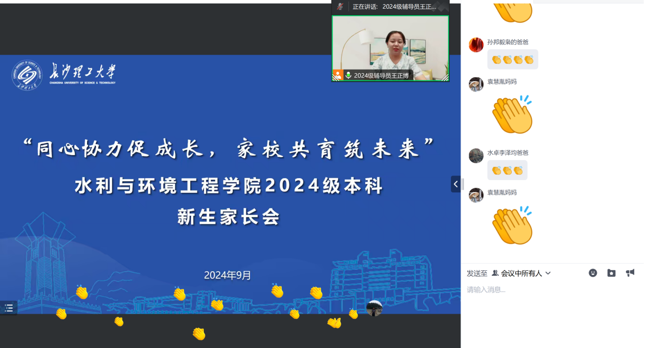 为进一步强化家校联动,凝聚育人合力。水利学院于9月13日召开线上2024级本科新生家长会。学院党委书记喻玲娜、院长陈杰、院党委副书记银波、2024级新生辅导员王正博、李永睿出席,来自全国各地的700余名新生家长参会,会议由王正博主持。