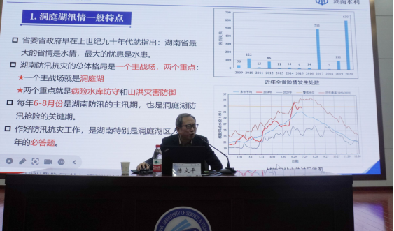 “洞庭湖是一块瑰宝”“洞庭湖是一座迷宫”“洞庭湖是一个命题”“万里长江,险在荆江,难在洞庭”,陈文平引用诗词名句,通过视频照片生动描绘展示了洞庭湖的壮丽风景与情况特点,通过历史变迁、治理成效与当前形势的对比,展示了洞庭湖的发展历程。“没有抢不住的险,只有没发现的险”,陈文平详细介绍了今年亲历团洲垸溃垸抢险的详细过程,作为抢险指导专家陈文平不仅为工作人员做思想工作,还细致落实了各项措施,确保了抢险工作的顺利进行。他指出,目前洞庭湖面临的主要问题包括:淤积萎缩、湿地生态系统退化和通航条件恶化,这些问题的严重性不容忽视,需要全社会共同努力解决。他表示,未来的洞庭湖应该是安澜洞庭、生态洞庭、粮仓洞庭、数字洞庭、美丽洞庭、幸福洞庭。