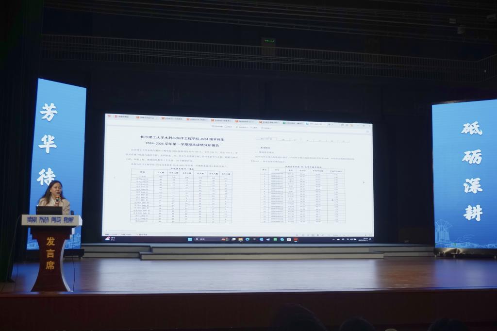王正博通过详实的数据,对2024级第一学期学业情况进行全面剖析。她对比年级平均绩点、挂科率、英语四级通过率等指标,指出当前存在的“学习动力分化”“时间规划不足”等问题,并提出建立“一对一帮扶小组”、开展“学霸微课堂”等针对性举措。她强调:“大学学习是一场长跑,唯有脚踏实地,方能厚积薄发。”并围绕安全教育、文明养成教育、班团建设等重点事项作部署。