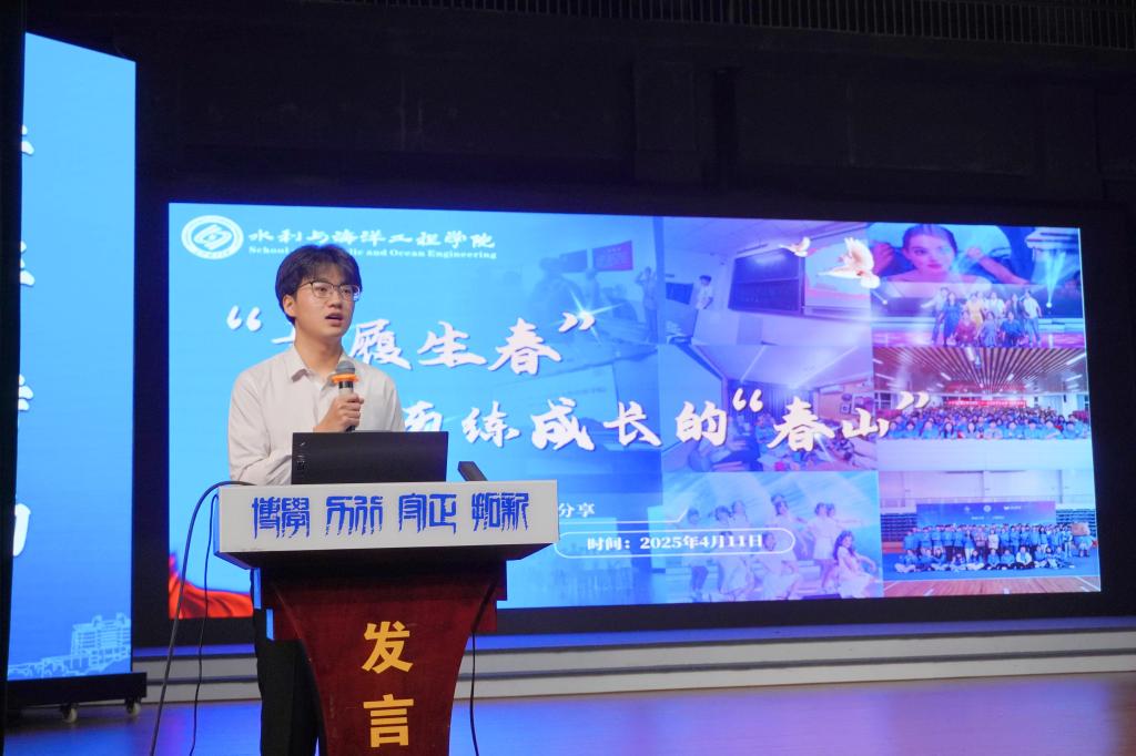 大会特别设置“榜样力量”先进个人分享环节。水文特岗2401班肖翊晗平均学分绩点3.98,她从“目标管理”“高效笔记法”“复习节奏”三方面传授学习心得;地信2401班高浩然英语四级632分,他强调“沉浸式学习法”,分享利用碎片时间精听、泛读的实用技巧;水利类2405班何佩澄作为读书活动先进个人分享了纸质阅读带给自身的成长力量,从书中感悟治水哲理,在实践中践行水利精神;给排水2202班王俊超以步履生春,勇攀历练成长的春山为题,分享了作为学生干部的信仰与使命,从拓荒山到攀高山再到赴群山,他鼓励新生“在服务他人中实现自我提升”。
