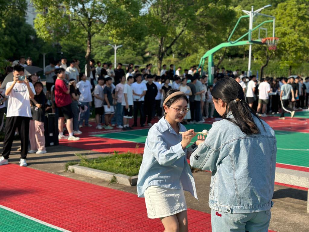 本次趣味运动会由年级工作组同学和班级审核员共同担任裁判员,确保活动有序进行。共设置了“筷送乒乓”“趣运气球”“两人三足”三个项目,同学们背对背,肩靠肩,手挽手,齐心协力向前行,既富有趣味性又强调协作性。在“筷运乒乓”项目中,地信2301班虽因乒乓球多次滑落而暂时落后,却上演了一幕比获奖更动人的团队故事,他们相互鼓舞,打气声“稳住节奏”“我们相信你”与规律的击掌声交织,为赛场筑起一道暖心的精神幕墙。赛后,该班体育委员说道:“比起名次,我们更珍惜共同面对挑战时的心跳同频——团队的温度比奖杯更珍贵。”