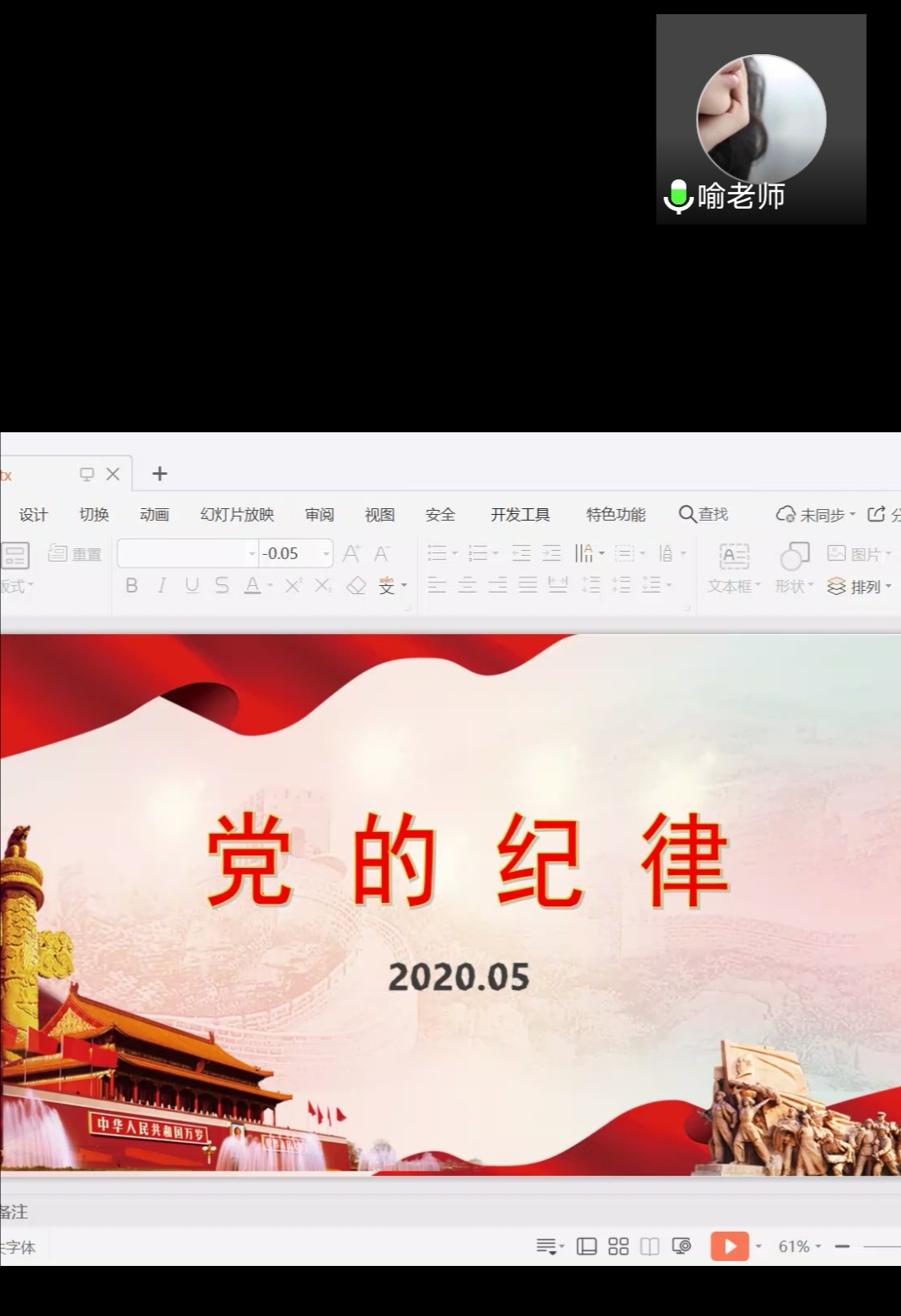 5月13日19:00,水利工程学院党委书记喻玲娜通过腾讯会议平台,以《党的纪律》为主题为水利、物电、艺术学院第11期发展对象联合培训班授课。