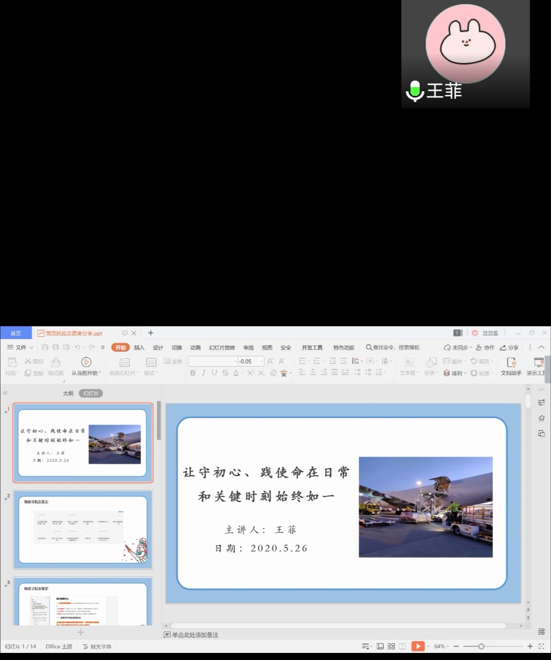 5月26日晚19:00,水利工程学院学生党总支开展了“我的战‘疫’ 党员初心”大讲坛活动。身在南非的水文系教工党员危润初老师以《我在非洲抗疫的日子》、2018级研究生党员王菲以《让守初心 践使命在日常和关键时刻都始终如一》为主题进行个人战“疫”故事分享。讲坛由学生党建辅导员黄远发主持,全体学生党员、发展对象参加。