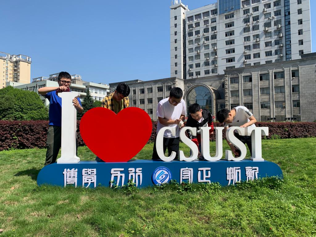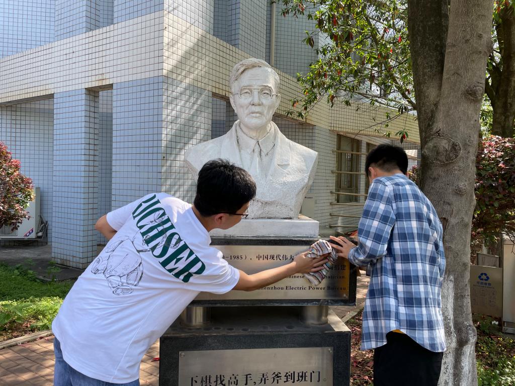 早上9点,同志们在宿舍门口集合,由于校园内雕塑分布较散,分成了5支队伍,分别前往9号教学楼、6号教学楼、南大门附近5个雕塑进行清理。大家见到沾满灰尘的雕塑,便积极地拿起劳动工具,开始清理脏污。