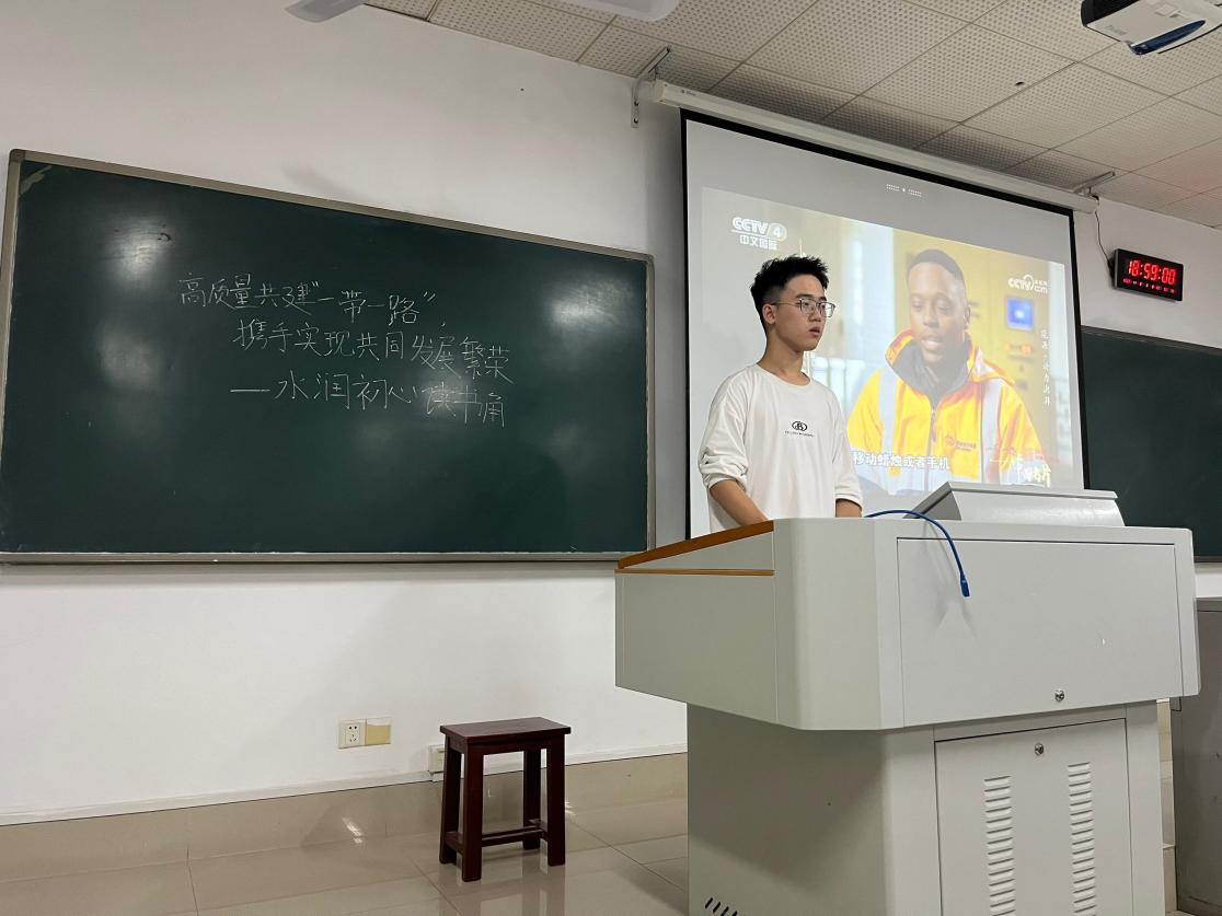港卓2001班何淑娴同志结合自身假期开展的绿色低碳排放实践,指出“推动‘一带一路’绿色发展,中国不仅有意愿、有决心,而且重行动、建机制。”水利类2205班冯琬梓表示,我国古代“天下大同,美美与共”的理想与共建“一带一路”的伟大构想有相通之处。