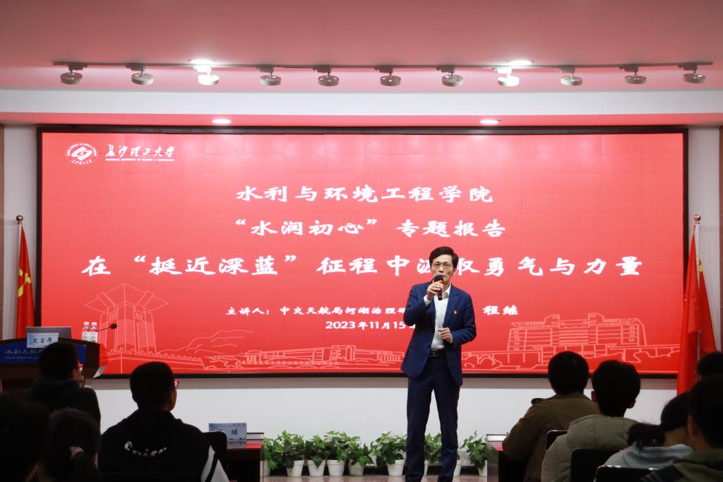 11月15日晚,水利学院在工三B319召开“水润初心”专题报告会。报告会特邀了中交天航河湖研究院总经理程继以“在‘挺近深蓝’征程中汲取勇气与力量”为题授课,学工办老师、各本科生、研究生代表共90余人参加会议,报告会由院党委副书记银波主持。