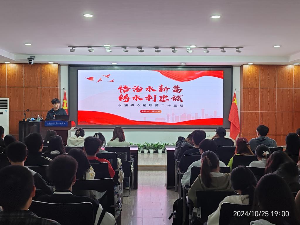 10月25日晚,水利学院于工三B319开展了主题为“悟治水新篇,铸水利忠诚”的第二十三期水润初心论坛活动,共计80名同志参加,此次论坛由本科生四支部党员蒋宇轩同志主持。