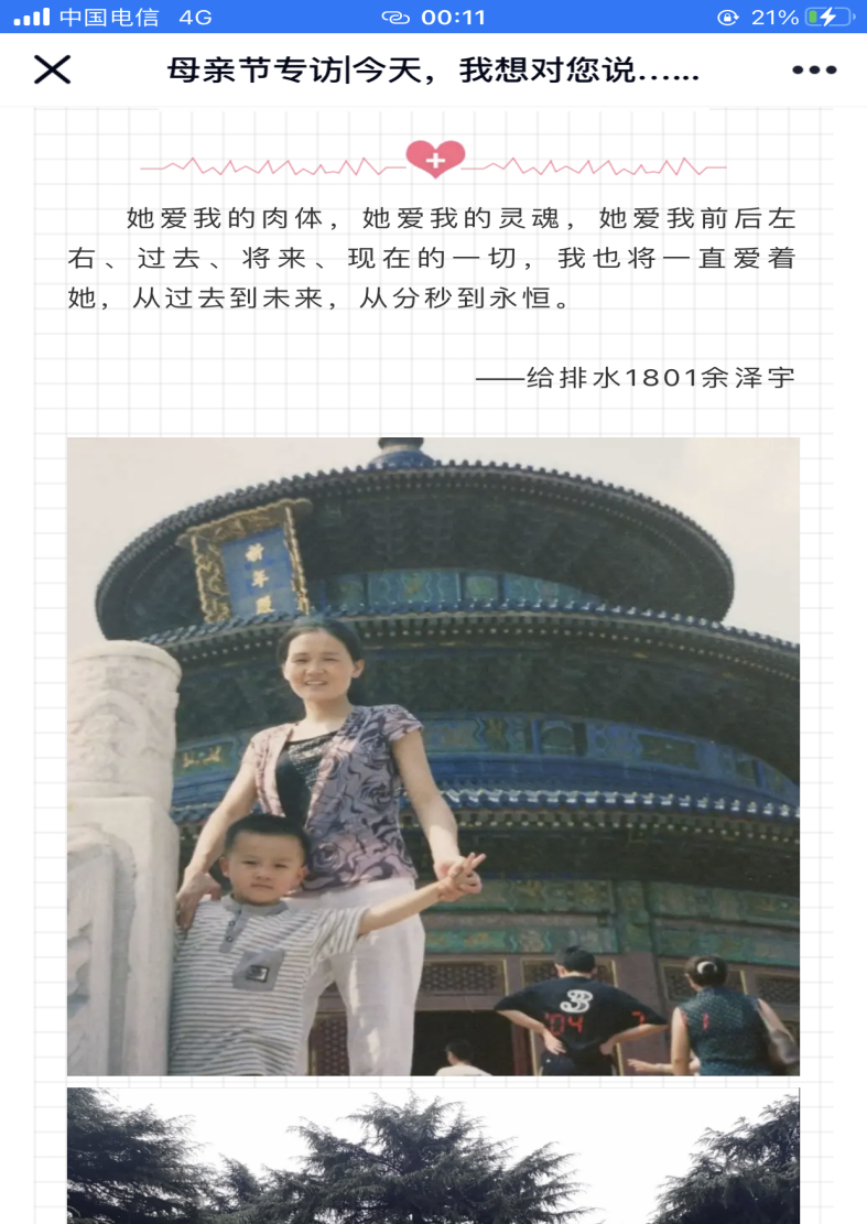 在“感恩要这样说”中,同学们选取记忆深刻的画面进行描述,为母亲写下一段最想说的但是从未敢说出口的文字并分享在QQ空间,勇敢地表达对母亲的爱。“她爱我前后左右、过去、将来、现在的一切,我也将一直爱她”是余泽宇对母亲的表白,通过这项活动,同学们勇敢对母亲说出了自己的爱与感恩。在“感恩要这样秀”中,同学们展示出自己与母亲的合影。李晓芸与母亲的合影记录了她从婴儿到现在的成长经历,余泽宇与母亲的合影留下了他和母亲共同成长的过程。这项活动让同学们重新回忆了与母亲的成长记忆。