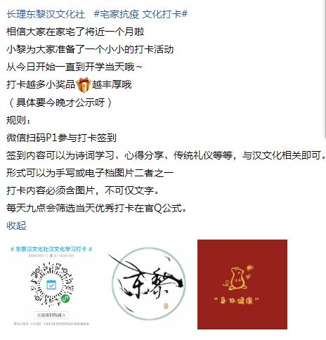 今年年初,由于疫情防控需要,同学们基本都停止了一切外出活动,安安静静地在家里“宅”了起来。为了鼓励大家即使在家里也保持日常学习的态度,我社特意举办了“宅家抗疫 文化打卡”活动,希望大家在家亦能积极学习相关文化,进行文化打卡。活动规则如下:大家微信扫码我社提供的小程序码进行打卡签到,签到内容可以是诗词学习、心得分享、传统礼仪等等,与汉文化相关即可;形式可以为手写或电子档图片二者之一。但打卡内容必须含图片,不可仅文字。官Q将于每天九点筛选当天的优秀打卡并发表说说向社团内部进行推荐。社团成员们可以通过我们的公示看到每次打卡的优秀作品,并进行学习分享,进一步鼓励大家一起学习打卡。