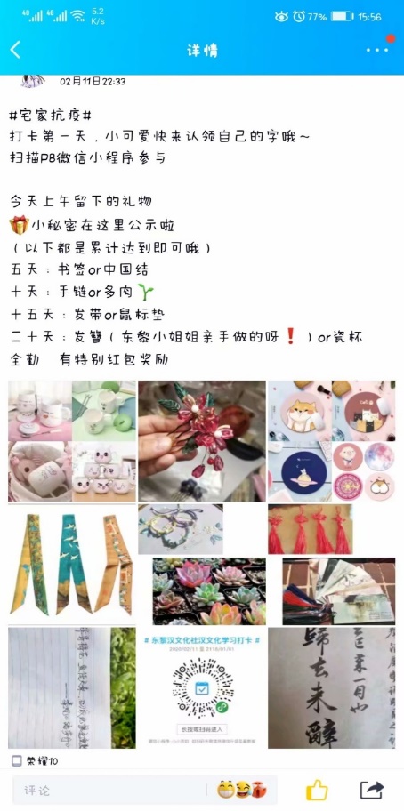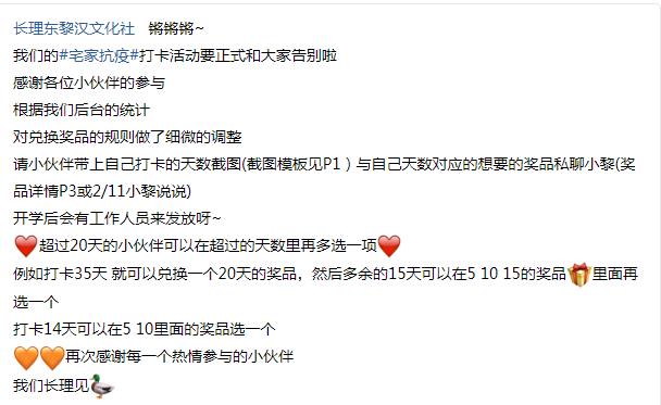 东黎汉文化社于2月11日-3月2日在线上举办疫情打卡活动。全校共20位同学参加了本次活动