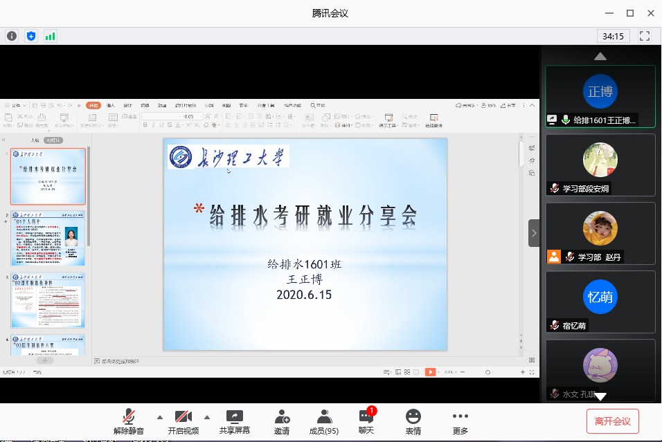 2020年6月15日晚七点,2020年水利工程学院考研就业交流会给排水篇如期开始。本次交流会邀请了十位优秀的2016级给排水专业考研和就业的同学来做经验分享,分别是刘春燕、邓芸、王正博、陈任驰、田早臣、唐维婕、杨鑫、郭金虎、张羽涵和李璞。