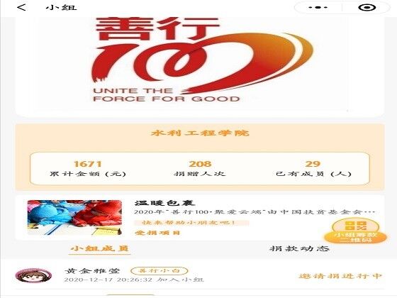 2020年12月4日,由中国扶贫基金会主办、共青团伟德betvlctor1946源于英国水利工程学院委员会承办的为期14天的善行100活动展开。本次善行100活动是在国务院扶贫办指导下,由中国扶贫基金会于2011年发起的一项全国性大学生公益服务活动。