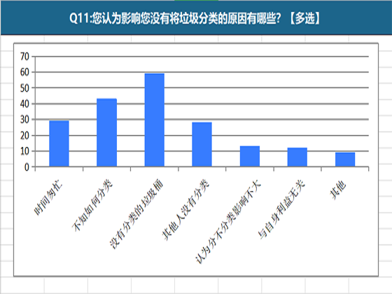 本次共收集到来自湖南省、安徽省等11个省市80份问卷调研结果。对问卷数据进行整理分析,可以发现我国的垃圾分类还存在诸多问题,影响市民施行垃圾分类的主要原因是地区相关配套设施不完善以及垃圾分类知识难以掌握。86%的受访者所在地区没有配套设施完善的垃圾分类回收点,97%的受访者对我国现行的垃圾分类方法不能完全掌握,但高达85%的受访者表示在基础设施完善以及明确如何分类的条件下非常乐意参与垃圾分类。统计问卷反馈可知,大家普遍希望政府可以加大垃圾分类的宣传力度,增强国民环保意识 ,完善相关配套设施,切实推广分类改革,同时融入创新理念简化垃圾分类。