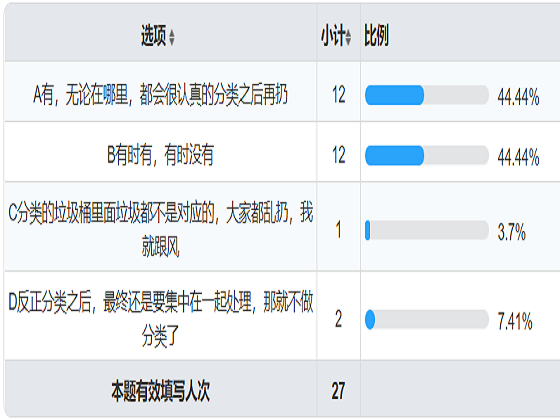 本次调研充分体现了居民对垃圾分类及处理的看法和了解,有利于提高居民垃圾分类的意识以及实践的参与度,也对本地垃圾分类和处理工作具有一定的指导意义。