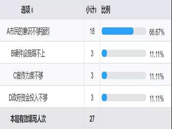 此次的调研围绕着垃圾的处理及垃圾的分类在人们的生活中的情况而展开。根据相关的情况制定问卷,通过网络发布给居民填写,最后收到27份有效的数据。根据调研结果,81.4%的居民对垃圾分类处理是认可的,但实际做到垃圾分类的次数则非常之少。据调查数据显示,其原因在于居民对垃圾分类处理的知识缺乏,很多垃圾不知道如何分类,从而导致居民鲜少对垃圾进行分类处理。从统计数据分析,66.7%的居民有垃圾分类处理的意识,但是对垃圾分类处理的意识并不强烈。77.7%的居民认为他所住的区域在垃圾处理上仍然存在问题。因此有必要对居民进行垃圾分类处理知识的普及,加大对垃圾分类处理的宣传力度,让居民能够更好地进行垃圾分类处理。