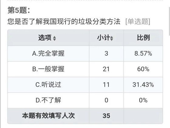 此次调研向位于湖南省的青少年采访收集数据,共收集有效数据35份。在调查期间发现,大部分家庭生活产生的厨余垃圾与塑料垃圾最多,完全掌握我国现行垃圾分类方法的只有8.57%,不会进行垃圾分类的占比37.14%,大部分家庭社区有垃圾分类回收点。根据调研结果,居民垃圾分类意识还不高,未能主动地进行垃圾分类,且缺乏垃圾分类知识。部分人认为宣传力度还不够。但是有77.14%的人表示如果基础设施完善会非常乐意参与垃圾分类活动。后续可以通过更多的措施来提高居民垃圾分类参与度。学校可以教授学生垃圾分类的知识,使其养成垃圾分类的良好习惯。政府部门加强宣传,大力提倡全民进行垃圾分类。同时,父母也应该给孩子树立好榜样,在家庭生活中自觉垃圾分类。有关部门可以改善垃圾桶的设计,正确引导人们自觉进行垃圾分类。