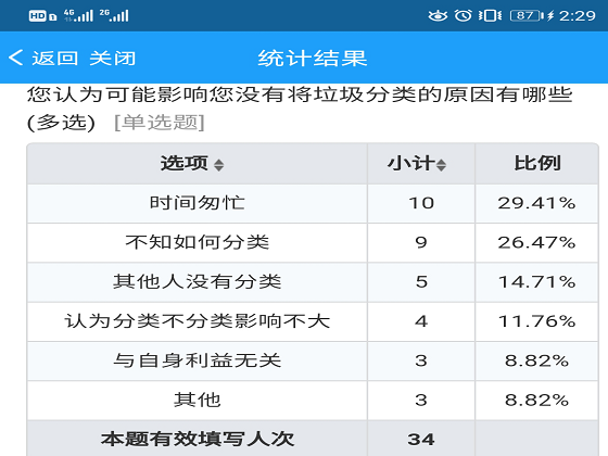 本次调研时间为7天,问卷调研主要形式为线上问卷形式。此次问卷共发出50份,收到的有效问卷为34份。此次调研围绕着每天都要面对的垃圾处理问题,从多方面反应每个家庭对于每天产生的垃圾的处理方式。据统计,每个家庭主要产生的垃圾为厨余垃圾,快递塑料盒与报纸书籍等。关于是否可区分可回收垃圾和不可回收垃圾,70.59%的家庭对可回收垃圾和不可回收垃圾具有一定的了解,而十分清楚这个问题的居民也有26.47%。对于可回收和不可回收垃圾的认识,是能对垃圾分类处理的一种表现,也是对环境保护的一种责任感。据了解,大多数人没有进行垃圾分类,主要是因为时间匆忙和不知道分类。垃圾分类的确是一件很小的事情,但同时需要花时间来了解和进行分类。养成垃圾分类的好习惯是自律的表现。