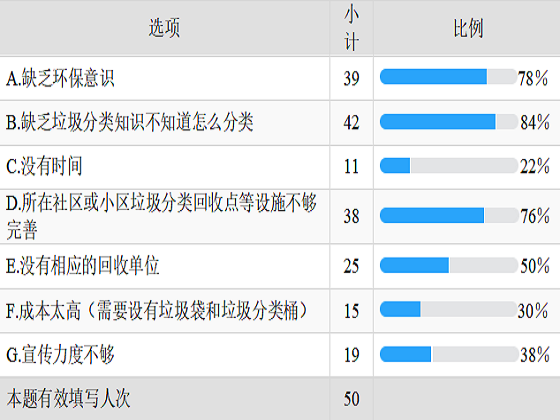 此次的调研共收到50份有效的数据,问卷辐射全国各地,其中广东省人数最多。数据显示,居民日常生活产出的垃圾所占比重最大的是厨余垃圾,其次是快递纸盒、塑料、废弃报纸(书籍)和金属。同时,有近70%的人认为不知如何分类和没有分类垃圾桶是没有进行垃圾分类的原因。被调研对象表示,当对垃圾分类有了一定了解,基础设施也比较完善后,愿意参与的占68%。这说明居民自主进行垃圾分类的意愿较高,但限于公共设施和分类知识缺乏等原因尚未开展。目前我国的垃圾分类还存在着许多问题,84%的人缺乏垃圾分类知识,78%的人缺乏环保意识,76%的人所在社区或小区垃圾分类回收点等设施不够完善。对于如何更好地宣传垃圾分类处理,64%的人认为政府的号召和规定是最有效的办法。为加快推进垃圾分类的建议,较多人认为应同时在宣传力度和实行力度两方面下功夫,并从教育抓起。