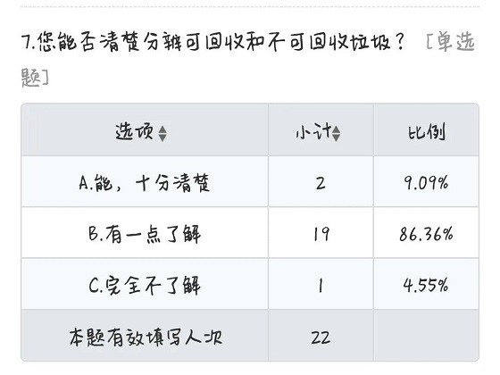 调研主要以居民对垃圾的分类意识与能力、生活区的制度与设备的完善程度为主要内容进行调查,收集了居民对垃圾分类普及落实的建议,共收集有效数据18份,其中83%来自常德市。据统计, 88.89%的居民不能准确分辨可回收和不可回收垃圾,对垃圾可回收性的判断能力有待提高。其中可回收垃圾主要包括废纸、塑料、玻璃、金属和布料五大类,但有一半的参与调研的居民错误地认为陶瓷是可回收垃圾。77.78%的居民对我国现行的垃圾分类方法掌握程度一般,不利于对垃圾分类的普及与展开。针对生活区域垃圾分类与处理,33.3%的居民生活区有分类垃圾桶,另外66.67%的居民生活区仅有垃圾分类回收点,但管理随意、相关配套设施不完善。83.33%的居民表示,没有分类垃圾桶对日常生活中进行垃圾分类影响较大。从调研数据可以看出,设施安装、分布不合理、标识不清楚等也是阻碍垃圾分类普及的重要因素。