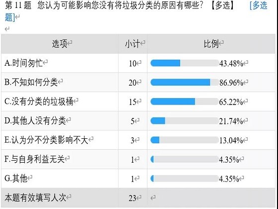 此次调研围绕家庭垃圾分类、对垃圾分类认识的程度、垃圾分类在各个城市的完善程度等方面展开,向位于湖南省、广东省两个大省的青年采访并收集数据,共收集有效数据23份。据统计,受访者中没有人对垃圾分类法完全掌握,有47.83%的人对其一般掌握,有43.48%的只听说过,此外还有8.7%的人不了解。本次调研人员家中的垃圾分类情况,绝大多数没有掌握垃圾分类法且没有一直在进行垃圾分类的家庭,有56.52%的不会进行家庭分类。有86.96%的居民表示影响自己没有进行垃圾分类的原因是不知如何进行垃圾分类。65.22%的居民表示在对垃圾分类有一定的了解且基础设施也完善的情况下自己很乐意进行垃圾分类。