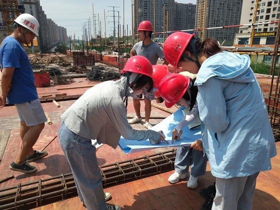 在指导老师孙鹰的带领下,该项目负责人与港航1702团支部成员进行沟通交流并对后续的工作进行了安排和布置。在详细了解需学习的内容以及具体的学习时间后,在项目部的施工员的带领下,团支部成员进入工地进行实习见习。在为期一个月的实习见习中,实践团成员围绕图纸、施工以及项目管理等相关内容进行实习见习,熟悉各项工作流程与规范并完成了测量混凝土回弹等工作任务。这次的创世纪宫寓项目属于工民建施工,虽与专业有一定的出入,但在知识内容和结构上有紧密联系。