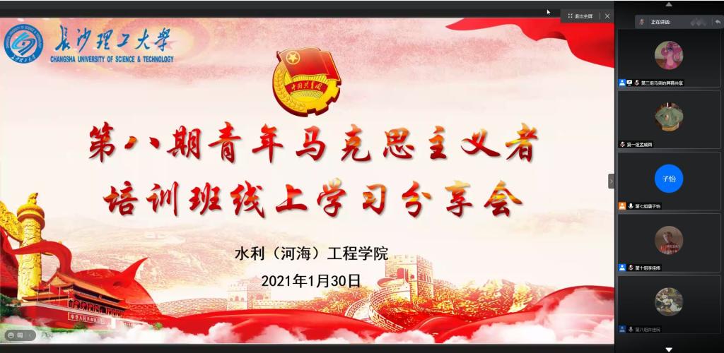 1月30日晚19:00,水利工程学院召开第八期青年马克思主义培训班线上学习分享会。参加本次会议的有院团委书记杜丘及第八期青年马克思主义者培训班学员,会议主持由康子怡和马栾担任。