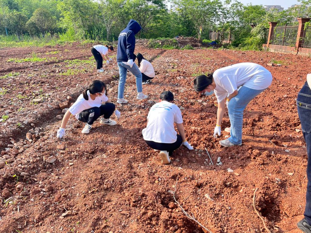 到达实践基地后,大家先清理种植田中的杂草和石块,与埋在地下的一块大石头“斗智斗勇”。在劳动过程中,老师们带头,同学们紧跟其后,动作由生疏到逐渐娴熟,劳动效率也在不断提高,经过一个下午的辛勤劳动,原本杂乱的土地变得规整有序。清理完荒地后,大家用锄头翻松土壤,播种下象征着希望的幼苗。大家在体会劳动的辛酸欢乐的同时,对劳动者们产生了由衷的敬佩。最后,大家共同插上了劳动实践基地标牌,给一天的辛勤劳动画上了圆满的句号。