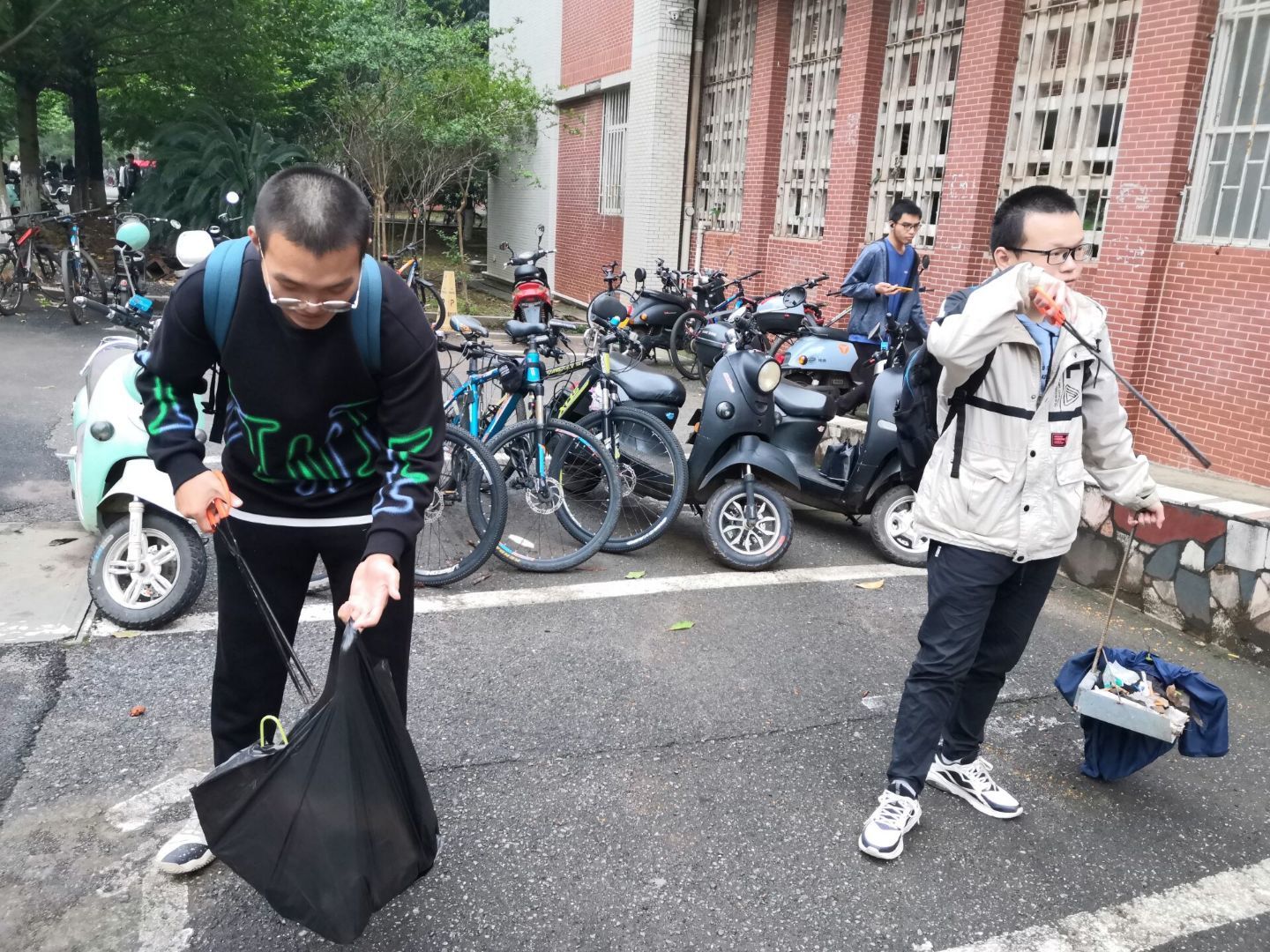 同学们在生活委员和青志协成员的共同组织下开始了清扫任务。同学们或是用扫帚堆起来沉积的落叶,或是用手捡起路边的垃圾。即使天气渐凉,也拦不住同学们清扫的热情,他们在各自的卫生分工区域认真清扫,还了校园一片洁净。