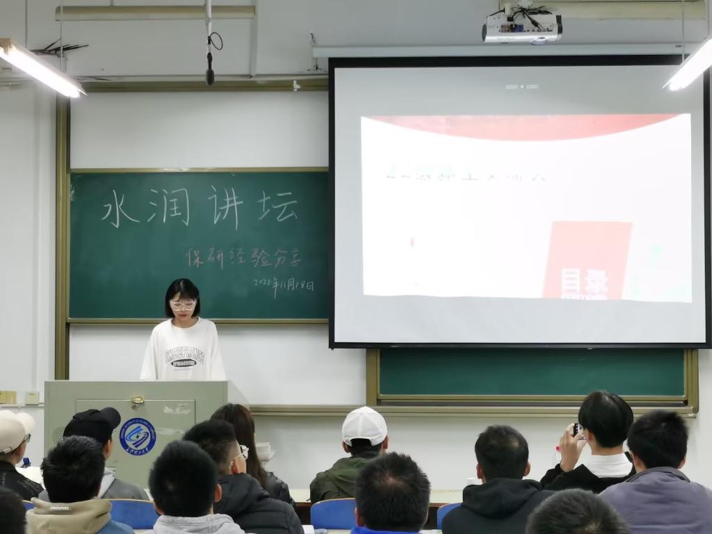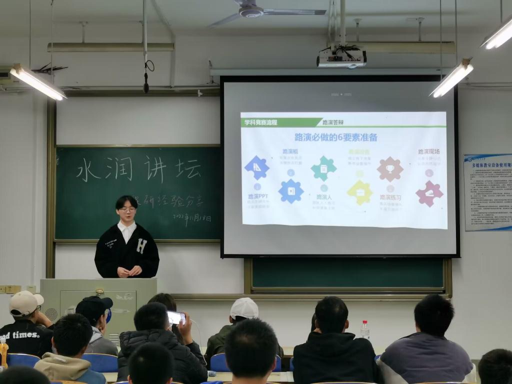 11月17日晚19:30,水利与环境工程学院于金盆岭校区6教203室举办2022-2023学年第3期水润讲坛,主题为“保研经验分享”。本次活动由汪磊、罗婉娇两位同学主讲,给2022级的同学讲解学科竞赛经验,并给出相关建议。