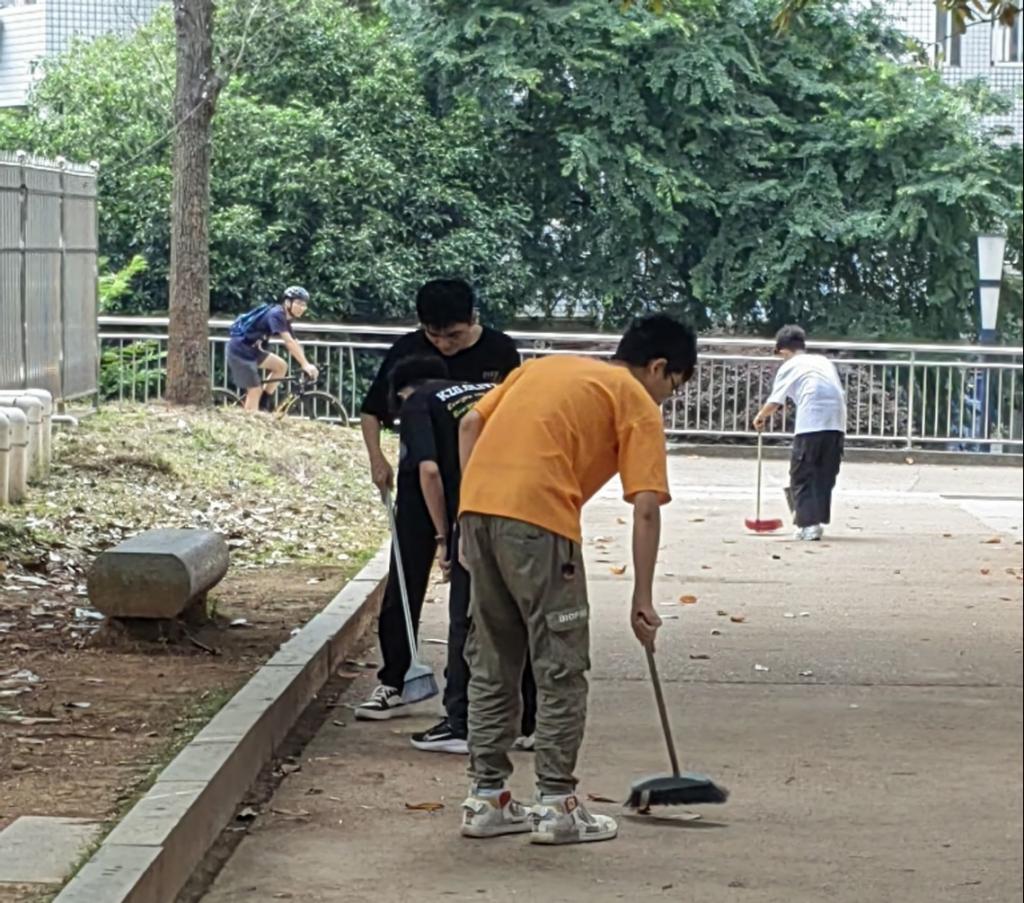 本次劳动实践活动中,大家的主要工作是将规定范围内路面上的落叶及草丛中或路沿边残留的垃圾清扫干净。同学们有序分工,通力合作,分段分区清扫,有的拿火钳清理细微处落叶,有的用簸箕清理堆积枝叶,有的用手拾起树枝上悬挂的垃圾......经过同学们的辛勤劳动,校园环境变得更清新美丽、整洁有序。