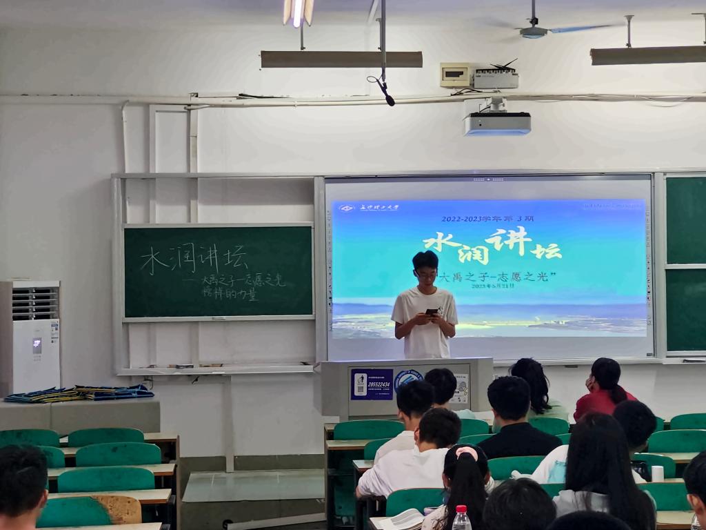 5月21日晚,水利学院在金盆岭校区举办“水润讲坛”系列活动,主题为“志愿之光——我与大禹之子青年志愿者协会的青春故事”。由现任大禹之子青年志愿者协会团支书李修儒,2021-2022年度大禹协会副会长邓婕及大禹宣讲队副队长张钰婷三位同学主讲,与2022级150余名同学畅谈志愿服务,共话青春奋斗。