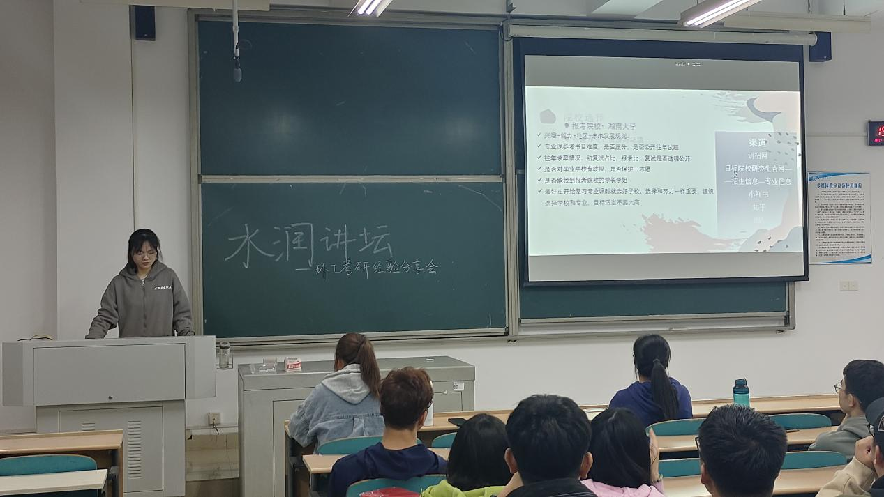 近日,水利与环境工程学院在云塘工科三号楼举办2022-2023学年第2期“水润讲坛”,主题为“专业精品讲坛之考研经验分享”。本次讲座共分为环境工程、水利水电工程、港口航道工程、给排水科学工程、水文与水资源工程五个会场,分别由16名考研之星为同学们讲授备考经验,分享考研干货和解读考研形势。
