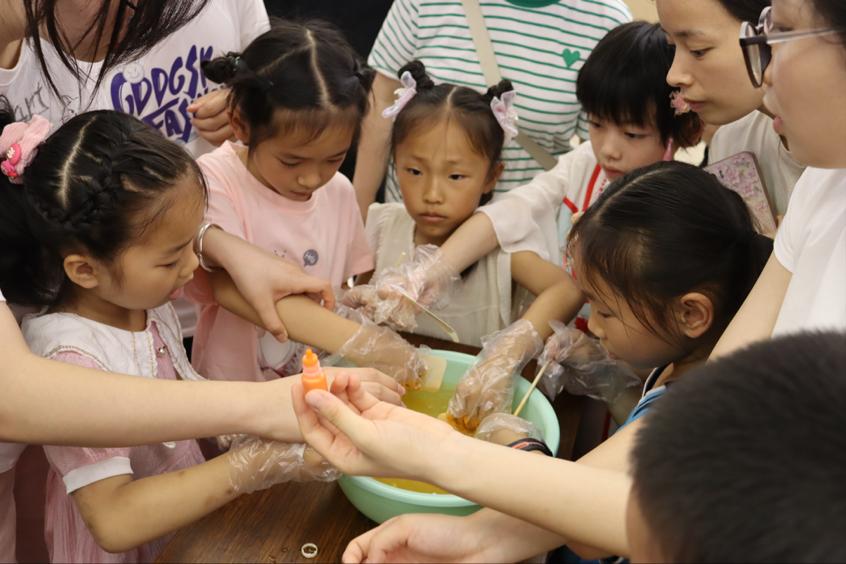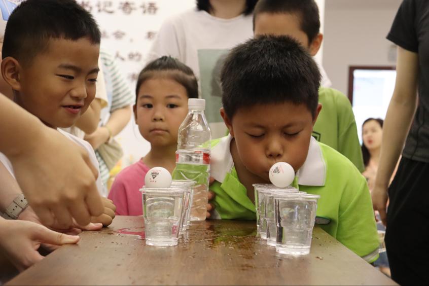 活动伊始,志愿者以《雪孩子》动画片为引,生动有趣地将小朋友们带入了神秘的水世界,探索水的秘密。“哇,真神奇!” 志愿者通过水知识实验,绘声绘色地为小朋友们展示“海底火山”模拟喷发、“彩虹泡泡龙”神秘现身,引得小朋友们连连发出惊叹。在游戏环节,志愿者们分成四个小组,分别带领小朋友进行组内比赛及书签制作。“预备!乒乓球过河比赛开始。”一声令下,小朋友们铆足了劲,将乒乓球吹过“小河”。“彩漆滴入水,白签缓慢入水……”书签重出水面时,每位小朋友在志愿者的指导下都自制了独一无二的斑斓书签。