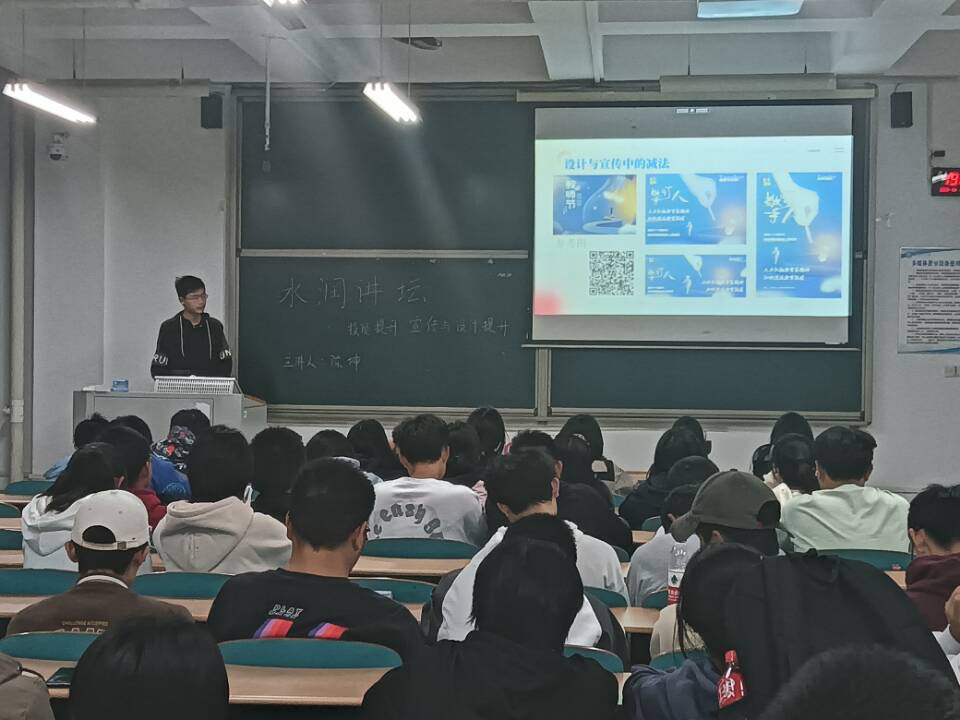 11月1号晚,水利学院在云塘校区工科三号楼B-220室举办了第39期“水润讲坛”之宣传设计经验分享会。本次讲坛邀请到了校阳光传媒工作室设计部副部长兼院设计部部长陈坤同学主讲,与同学们分享特色的宣传设计经验,活动共吸引七十余名学生参加。