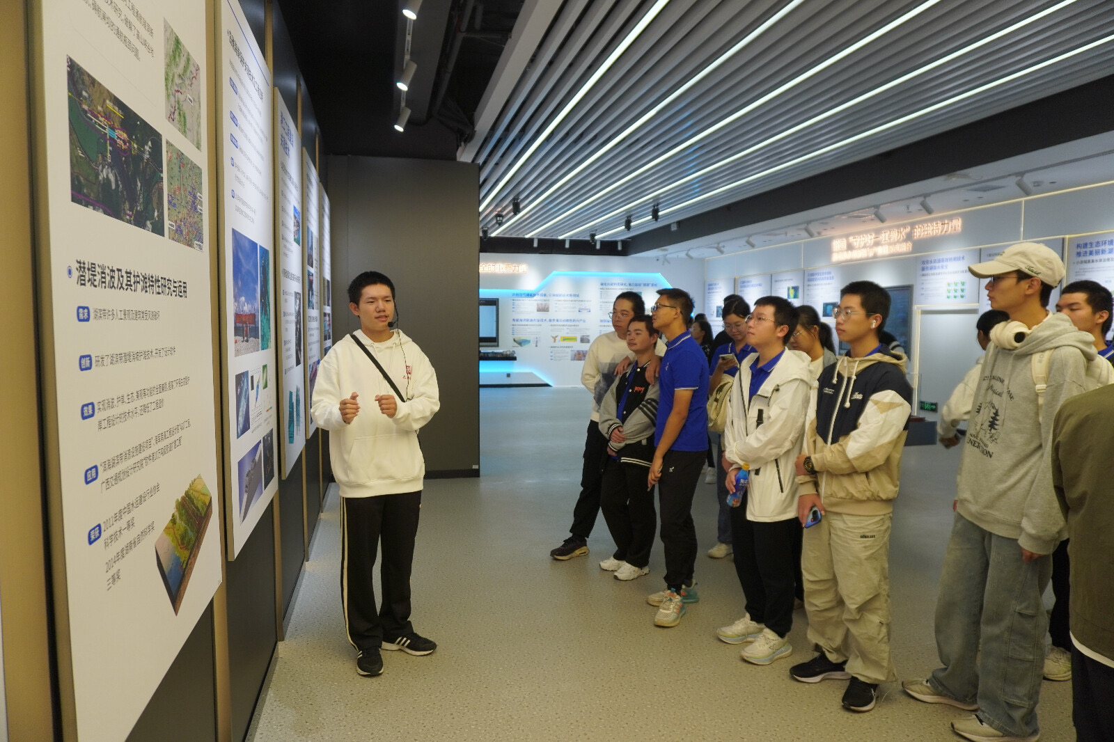 在讲解志愿者的带领下,2024级研究生有序地走进了实验室。志愿者为同学们详细介绍了在水环境治理和生态修复方面的研究成果和技术应用,展示了高桩码头、拱坝、鱼道、沙槽、船闸等水利工程结构模型,并讲解了水利工程设施的组成及工作原理。同学们认真聆听讲解,与志愿者们积极互动交流。