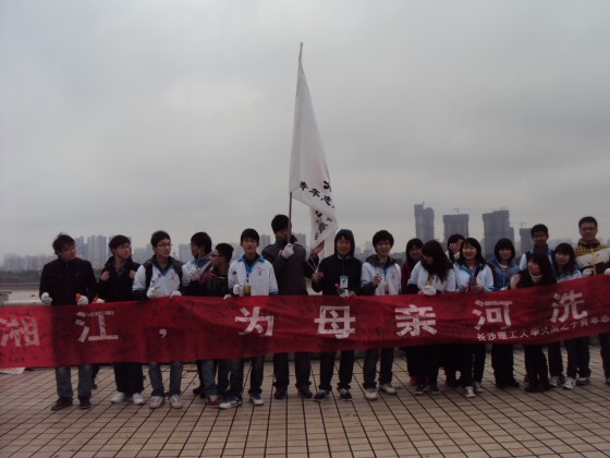 活动当天下着蒙蒙细雨,志愿者们的热情却依旧很高,短暂而隆重的启动仪式过后,活动正式开始。首先志愿者们以10人为一组清理湘江江滩垃圾,大家带好手套、操着工具全身心投入工作当中,接近中午时分,志愿者们手中的塑料袋装满了各种“战利品”,堆在一起成了一座小山。橘洲环卫所的环卫工人推来垃圾车,志愿者和环卫工人一起将垃圾搬上垃圾车,送到垃圾站。随后,所有活动参与者在一块绘有湘江长沙段的图形的画布上留下自己独特的脚印,作为本次环保活动有力的见证。