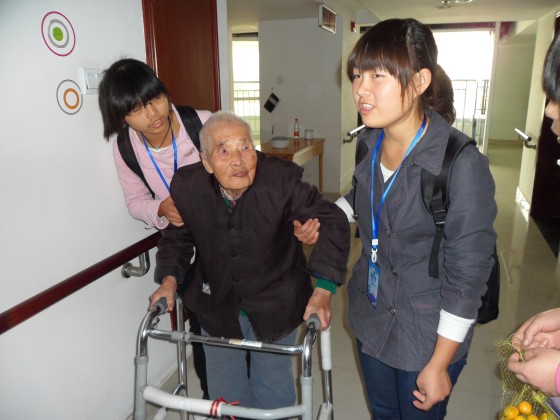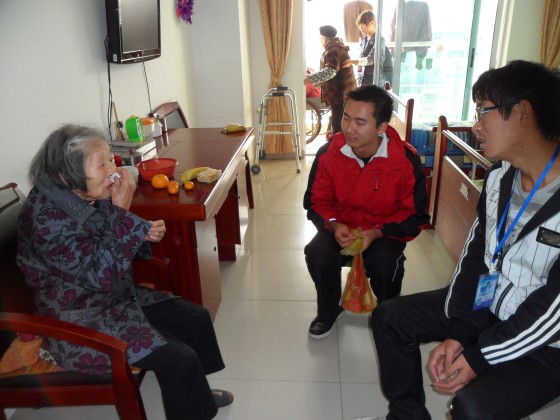 在福利院里,志愿者们分为了四个小组,分别照看老人。他们围在老人的身旁,和老人一起晒着暖暖的太阳,帮老人揉揉肩、锤锤腿,伴随老人散步,听老人们讲着过去的故事,体会老人人生的感悟。一位老爷爷自告奋勇地题字送给同学们,不少同学被老人的热情所感染,纷纷展示着自己的才艺,有的唱起了歌,有的吹起了葫芦丝,福利院里充满了浓浓的爱。