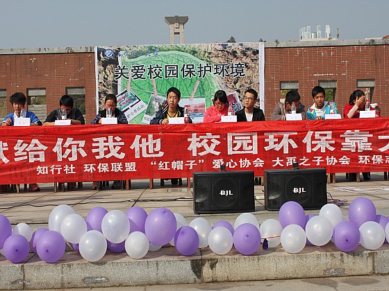 11月20日下午,大禹之子协会、红帽子协会、环保志愿者协会和知行社在文化广场上联合举办了主题为“美丽你我他,校园靠大家”的关爱校园,保护环境大型校园环境保护活动,共同维护我们周围的生活环境。