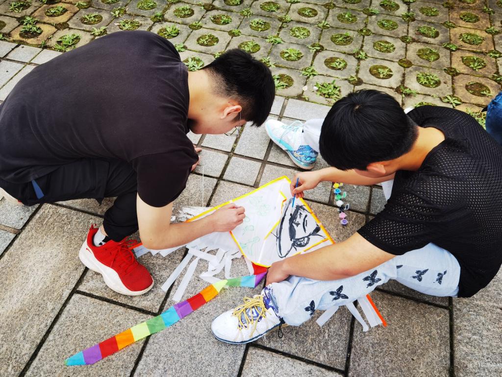 本次活动内容包括制作风筝、报团小游戏、两人三足游戏、知识抢答等四个环节。风筝制作现场,我们常常看到一些同学忘我地投入其中。为了画好一个细节,干脆匍匐在地上,画画的同学,全神贯注、一动不动。今年正值建党一百周年,在制作风筝的环节中,大家还展现了对党、对于国风的创意。制作完毕后,大家进行放飞。