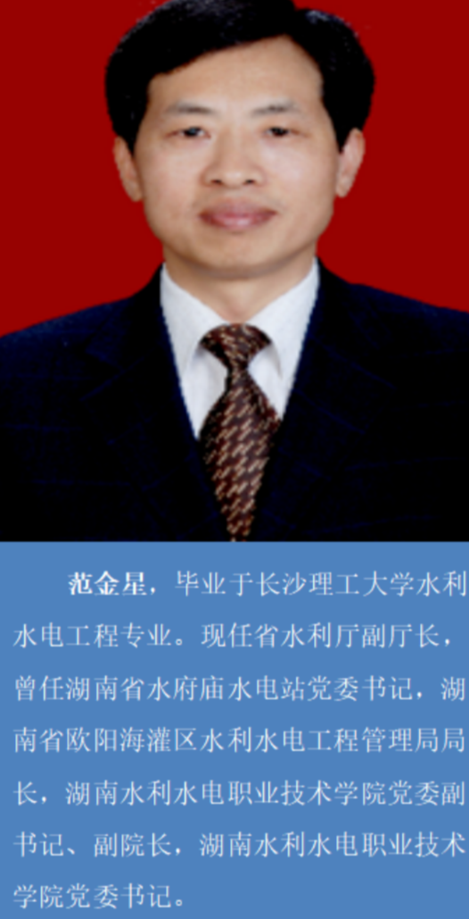 范金星,毕业于伟德betvlctor1946源于英国水利水电工程专业。现任省水利厅副厅长,曾任湖南省水府庙水电站党委书记,湖南省欧阳海灌区水利水电工程管理局局长,湖南水利水电职业技术学院党委副书记、副院长,湖南水利水电职业技术