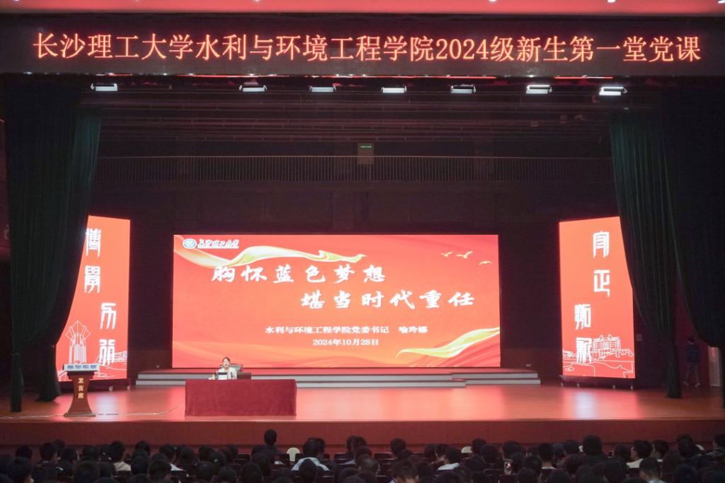 10月28日晚,水利学院在云塘校区大会堂举行2024级新生第一堂党课,学院党委书记喻玲娜为951名2024级研究生、本科生新生讲授第一堂党课。