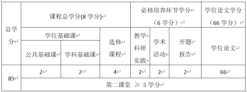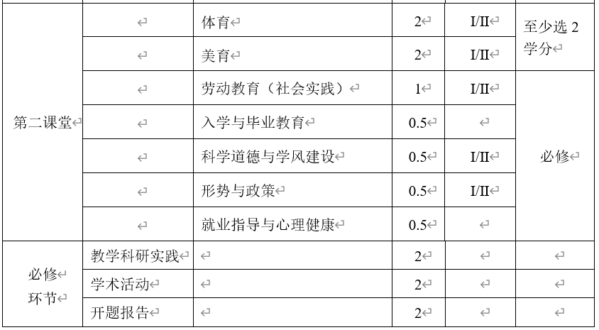 2.学生至少获得第二课堂5学分方可毕业。第二课堂活动学分认定见《伟德betvlctor1946源于英国研究生第二课堂学分管理办法》。其中,体育和美育类课程一共2学分,劳动教育(社会实践)1学分,科学道德与学风建设0.5学分,形势与政策0.5学分,入学教育0.5学分,就业指导与心理健康0.5学分。