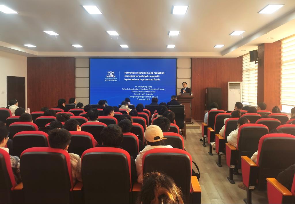方教授首先介绍了澳大利亚及墨尔本大学的基本情况,并热烈欢迎在场的师生前往墨尔本大学进行交流与学习。随后,方教授正式开始了学术报告,首先对多环芳香烃(PAHs)的基本概念进行了详细讲解。方教授指出,多环芳香烃通常出现在油炸、烟熏和烧烤等食品的表面,并且在不同食品中的形成机制各有差异。报告中,方教授进一步分析了多环芳香烃形成的主要影响因素,涵盖了食品的组成和特性、加工方式与条件、包装材料及储藏方式等。他强调,通过对这些影响因素的合理调控,可以有效减少多环芳香烃的生成。例如,选择合适的食品原料、使用抗氧化剂、以及优化加工工艺等措施,都能够在一定程度上降低食品中多环芳香烃的含量。最后,方教授分享了自己研究团队在减少多环芳香烃生成方面的最新研究成果,为在场师生提供了宝贵的研究思路与启示。