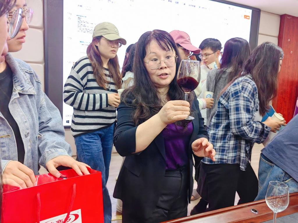 蒋雪薇从大众喜欢的“红酒加雪碧”引入干红和甜红的区别,深入讲解了葡萄酒的悠久历史、不同产区的特色以及品鉴的要点,让研究生们对葡萄酒文化有了更深刻的认识。