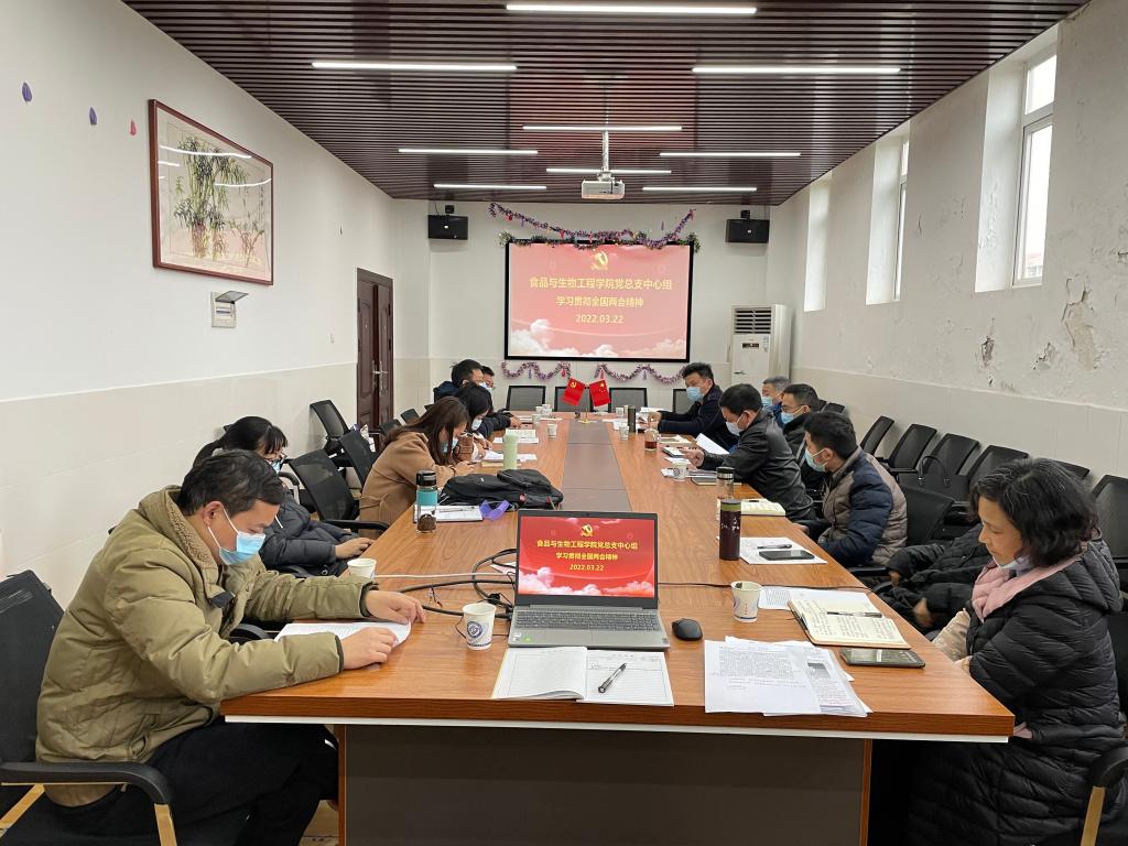 2022年3月22日,学院党总支理论学习中心组在工三楼A349会议室组织集中学习了全国两会精神,会议由院党总支书记副书记练黎旋主持,书记王建辉领学,生物工程系副主任陈永发和食品本科生支部书记胡佳佳做补充,院领导班子成员、系主任、支部书记参加学习。