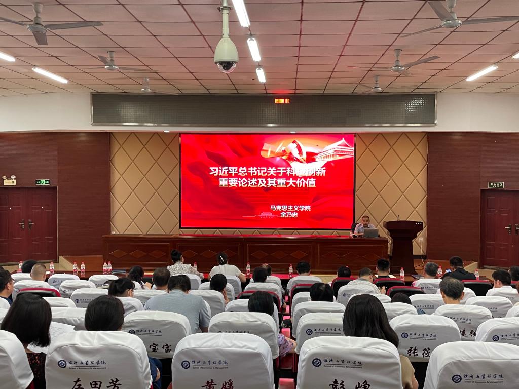 为持续学习贯彻习近平新时代中国特色社会主义思想和党的十九大及十九届历次全会精神,进一步推进“笃信长理建设”,6月21日下午,马克思主义学院余乃忠教授在云塘校区文科楼A200会议室为食品学院和经管学院进行理论宣讲。宣讲主题为《习近平总书记关于科技创新重要论述及其重大价值》,食品学院和经管学院教职工到会参加了本次宣讲。