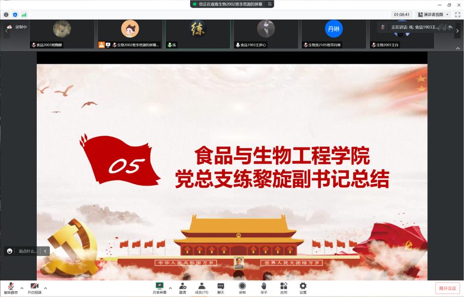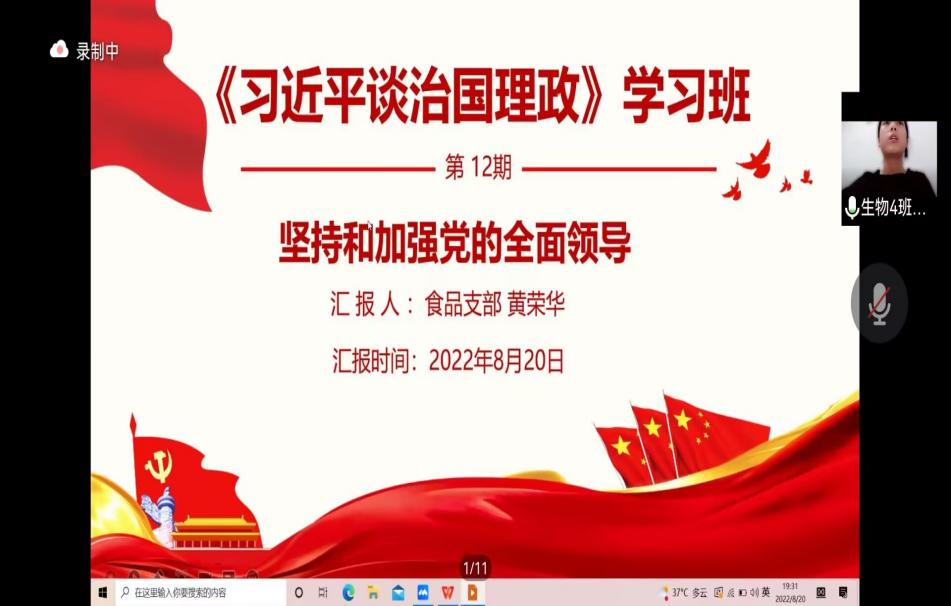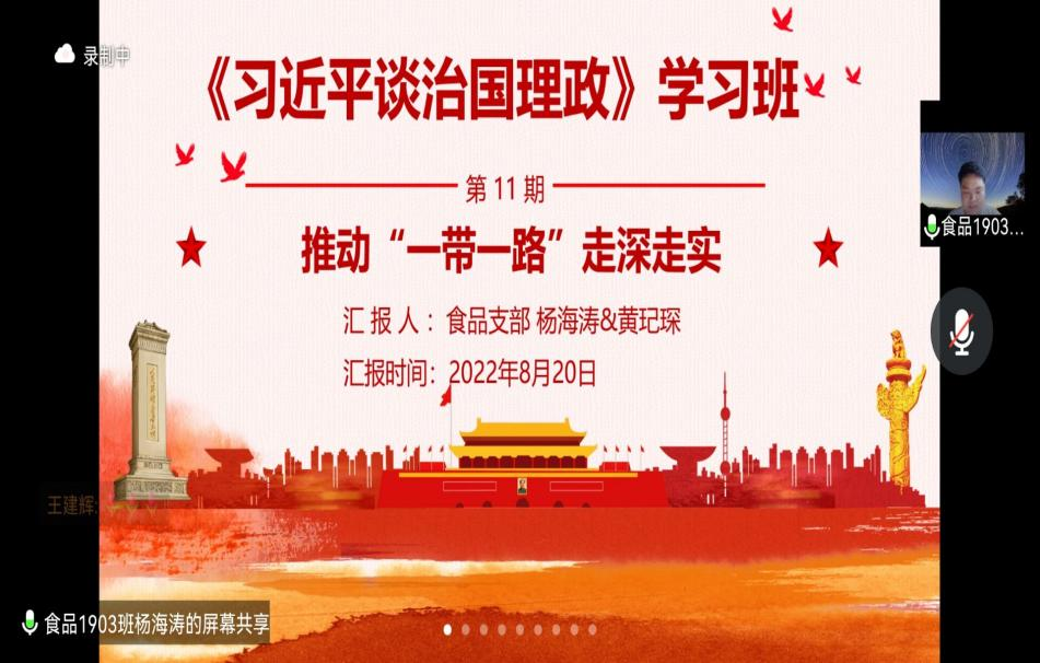 2022年8月20日,伟德betvlctor1946源于英国食品与生物工程学院食品本科生党支部在腾讯会议举办《习近平谈治国理政》读书班第六次读书分享会。食品学院党总支书记王建辉、党总支副书记练黎旋、学工办老师胡佳佳等师生近100余人参加此次活动。