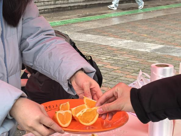 尽管春寒料峭、细雨纷飞,志愿者们的服务热情却空前高涨。据统计,食品学院前后六批志愿者共计59人,累计销售脐橙690.79斤,服务师生220余人次。在活动过程中,食院学子充分发挥专业优势,将学科知识与实践活动相结合,积极宣传推广坪山村脐橙,提升品牌知名度。并主动邀请大家品尝脐橙,讲解选购技巧,帮助师生挑选橙子,现场氛围轻松愉快。一位保安同志表示:“购买你们的脐橙啊,不仅放心,更被你们的热情打动,心情也变好了。”