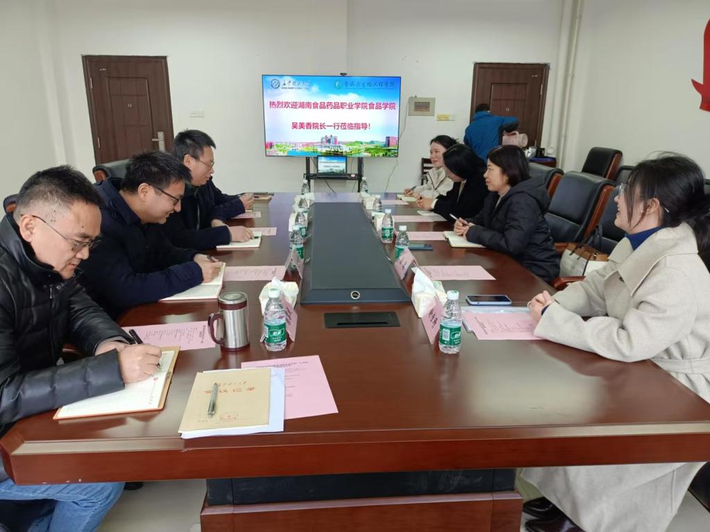 1月2日下午,湖南食品药品职业学院食品学院院长吴美香一行4人来院调研。学院党委书记高顺利、院长王建辉在云塘校区工科三号楼A329会议室会见客人。相关院领导和系室主任参加会谈。